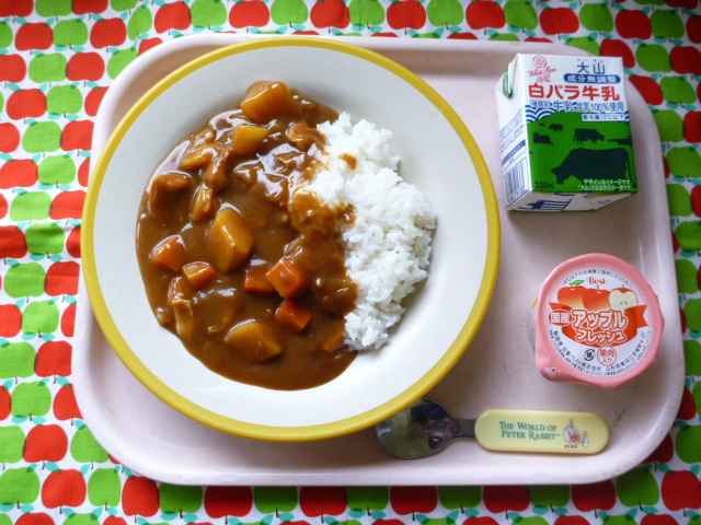 体も心もホカホカ☆あったかカレー☆(2020/10/28) ★ ごはん★◆●チキンカレー★ りんごゼリー ※あたたかいご飯・カレーはおかわり自由です。※牛乳は年長希望者のみです。★熱や力になるもの ◆血や肉になるもの ●体の調子を整えるもの ツイート