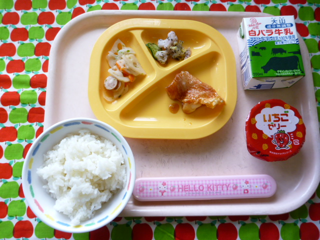 磯の香りのシャキッとれんこん(2020/11/09) ★ ごはん◆ 赤魚の煮付け◆● れんこんのり塩炒め● ゆかり和え★ いちごゼリー ※あたたかいご飯は、おかわり自由です。※牛乳は年長希望者のみです。★熱や力になるもの ◆血や肉になるもの ●体の調子を整えるもの ツイート