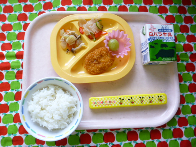 コーンたっぷり♪ほくほくコロッケ♪(2020/11/10) ★ ごはん★ コーンコロッケ◆● キャベツツナ炒め● 大根サラダ● ぶどう ※あたたかいご飯は、おかわり自由です。※牛乳は年長希望者のみです。★熱や力になるもの ◆血や肉になるもの ●体の調子を整えるもの ツイート
