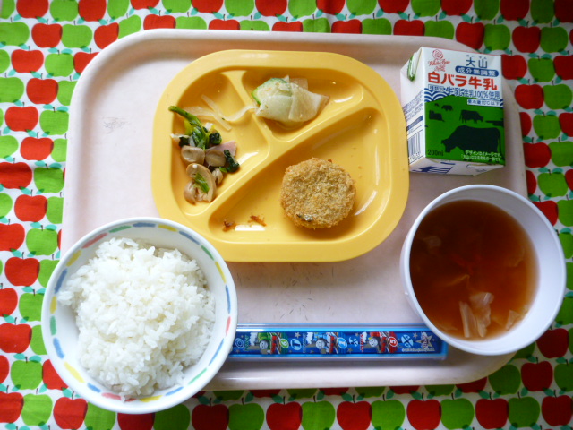 じゃこたっぷり☆カルシウムも(2020/12/16) ★ ごはん★◆ じゃこコロッケ◆● ほうれん草ソテー◆● 大根サラダ● トマトスープ ※あたたかいご飯とスープは、おかわり自由です。※牛乳は年長希望者のみです。★熱や力になるもの ◆血や肉になるもの ●体の調子を整えるもの ツイート