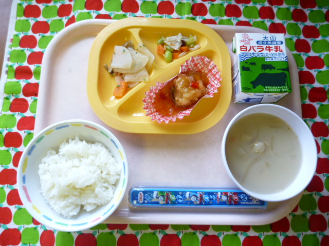 旬の大根☆今日は洋風のソテーに(2020/12/23) ★ ごはん◆● タラの甘酢だれ◆● 大根とベーコンのソテー● ビーンズサラダ◆● 豆乳スープ ※あたたかいご飯とスープは、おかわり自由です。※牛乳は年長希望者のみです。★熱や力になるもの ◆血や肉になるもの ●体の調子を整えるもの ツイート