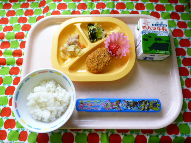海藻はミネラルたっぷり!(2021/03/05) ★ ごはん★ おさつコロッケ◆● キャベツツナ炒め◆● 海藻サラダ● いちご ※あたたかいご飯はおかわり自由です。※牛乳は年長希望者のみです。★熱や力になるもの ◆血や肉になるもの ●体の調子を整えるもの ツイート