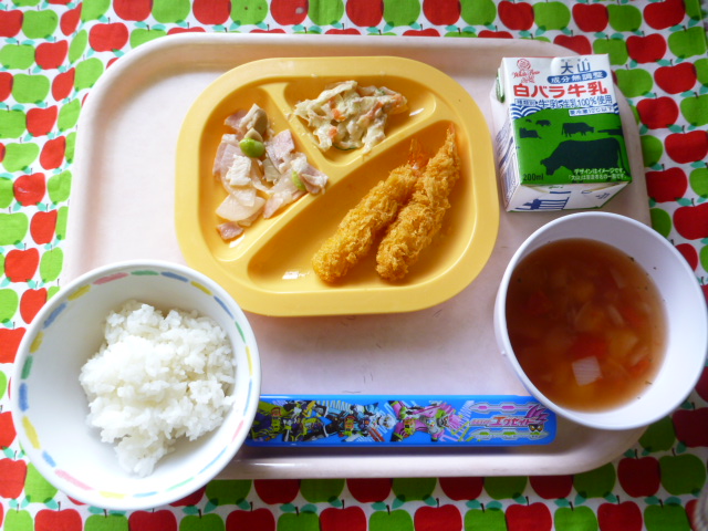 サクサクおいしい♪エビフライ♪(2021/03/10) ★ ごはん◆ エビフライ◆● 大根のソテー◆● コールスローサラダ★● トマトスープ ※あたたかいご飯とスープは、おかわり自由です。※牛乳は年長希望者のみです。★熱や力になるもの ◆血や肉になるもの ●体の調子を整えるもの ツイート