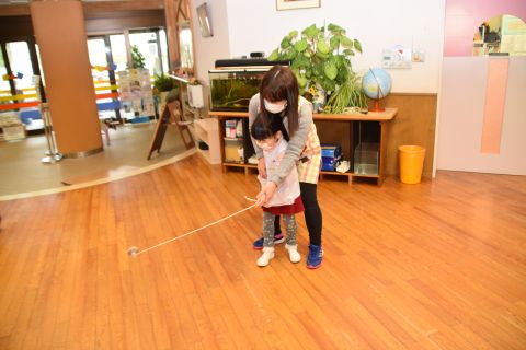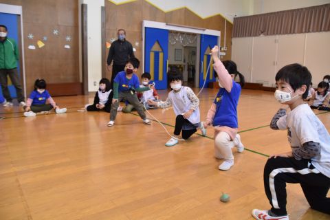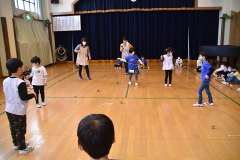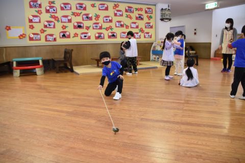 3学期になってから、昨年クリスマスプレゼントとしてサンタさんからもらったコマを園に持ち寄り、みんなでコマ回し大会に向けて練習をしました。