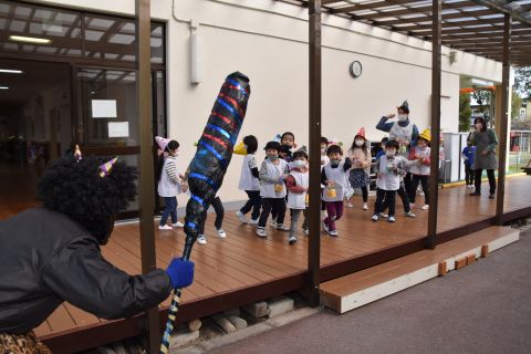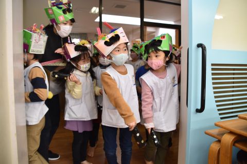 最初に年長組の子どもたち扮する鬼が、ちいさい組の子どもたちの教室を回りました。