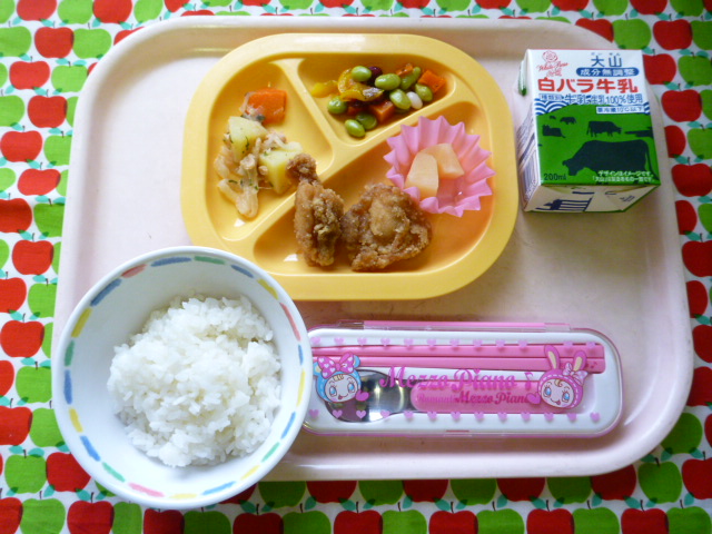 みんな大好き☆鶏の唐揚げ☆(2021/04/28) ★ ごはん◆● 鶏の唐揚げ● ツナじゃが◆● ビーンズサラダ● りんご缶 ※あたたかいご飯はおかわり自由です。※牛乳は年長希望者のみです。★熱や力になるもの ◆血や肉になるもの ●体の調子を整えるもの ツイート