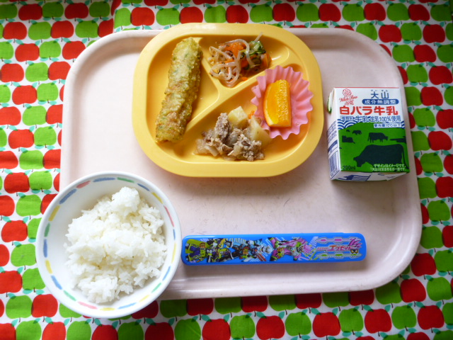 おふくろの味☆肉じゃが(2021/05/21) ★ ごはん★◆●肉じゃが◆ ちくわ青のり揚げ● ナムル● オレンジ ※あたたかいご飯はおかわり自由です。※牛乳は年長希望者のみです。★熱や力になるもの ◆血や肉になるもの ●体の調子を整えるもの ツイート