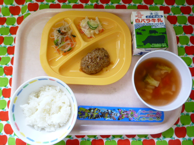 テリッと輝く☆照り焼きハンバーグ☆(2021/06/02) ★ ごはん◆ 照焼きハンバーグ★◆●春雨ソテー★● コールスローサラダ● トマトスープ ※あたたかいご飯とスープは、おかわり自由です。※牛乳は年長希望者のみです。★熱や力になるもの ◆血や肉になるもの ●体の調子を整えるもの ツイート