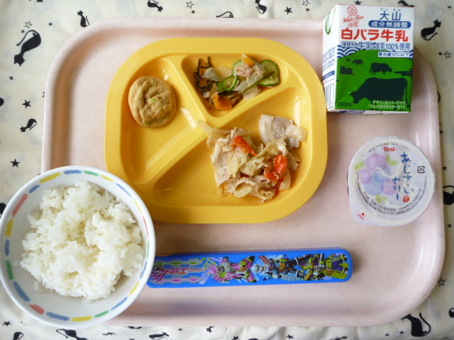 6月はあじさい☆キレイな色のゼリーだよ ★ ごはん◆●豚と野菜の味噌炒め◆●がんも煮◆●大根の塩昆布和え★ あじさいゼリー ※あたたかいご飯はおかわり自由です。※牛乳は年長希望者のみです。★熱や力になるもの ◆血や肉になるもの ●体の調子を整えるもの ツイート
