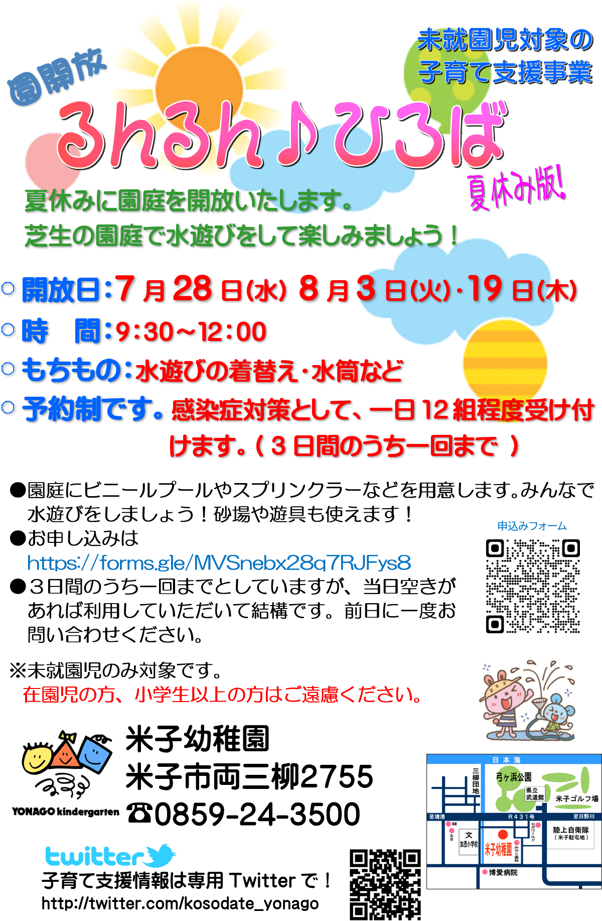 未就園児対象「園開放 るんるん♪ひろば 夏休み版」(2021/07/28・08/03・08/19) お申し込みは以下の申し込みフォームでお願いします。 https://forms.gle/MVSnebx28q7RJFys8 ツイート
