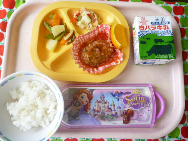 お弁当の定番☆ハンバーグ♪(2021/07/09) ★ ごはん◆● ハンバーグトマトソース★● ポトフ◆ コールスローサラダ● オレンジ ※あたたかいご飯はおかわり自由です。※牛乳は年長希望者のみです。★熱や力になるもの ◆血や肉になるもの ●体の調子を整えるもの ツイート