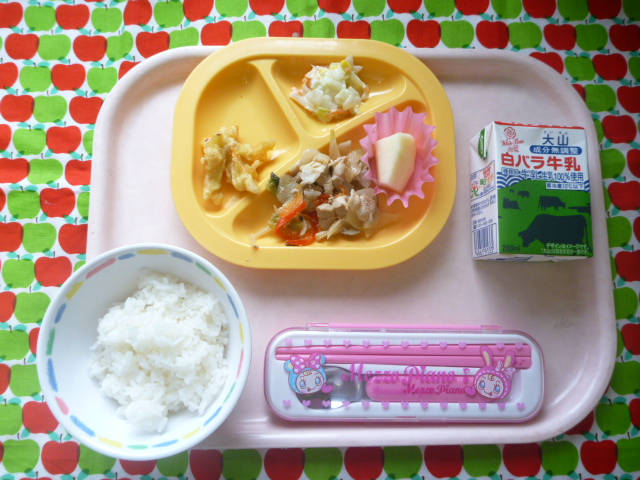今日のかき揚げはさつま芋だよ♪(2021/09/03) ★ ごはん◆● 豚のさっぱり炒め★● かき揚げ★● コールスローサラダ● りんご ※あたたかいご飯はおかわり自由です。※牛乳は年長希望者のみです。★熱や力になるもの ◆血や肉になるもの ●体の調子を整えるもの ツイート