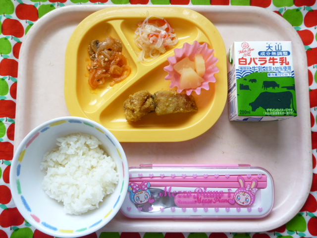 カレー味で食欲アップ↑↑(2021/09/24) ★ ごはん◆ アジのカレータツタ◆● ポークチャップ● 春雨サラダ● パイン缶 ※あたたかいご飯はおかわり自由です。※牛乳は年長希望者のみです。★熱や力になるもの ◆血や肉になるもの ●体の調子を整えるもの ツイート