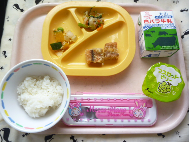 かぼちゃはカロテンたっぷり☆(2021/10/12) ★ ごはん◆ 鮭の竜田揚げ◆● かぼちゃのそぼろ煮◆● おかか和え★ マスカットゼリー ※あたたかいご飯はおかわり自由です。※牛乳は年長希望者のみです。★熱や力になるもの ◆血や肉になるもの ●体の調子を整えるもの ツイート
