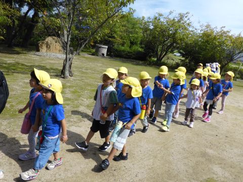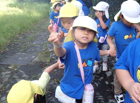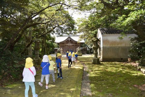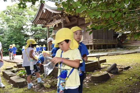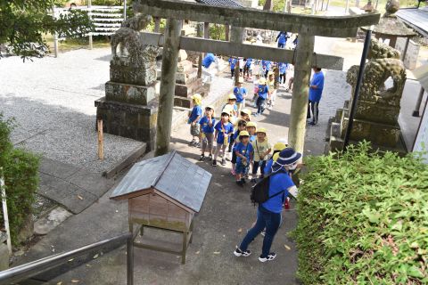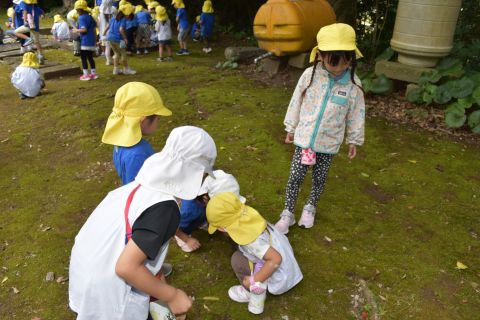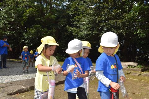 粟島神社遠足(年中)(2021/09/24) 薄暗い森の中を、ドキドキしながら八百姫がいたという洞穴を見に行く子ども達。おそるおそる中をのぞき込み、誰もいないことにほっとした表情でした!中には何か見えた子もいたようですよ。その後、187段の長い階段を頑張って上がると、しいの実がたくさん落ちていました。夢中でしいの実を拾う子どもたち、とっても嬉しそうな笑顔をたくさん見せてくれましたよ☆ ツイート