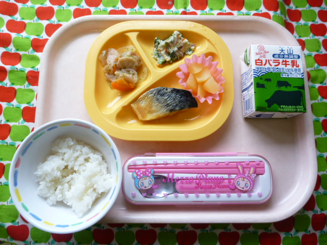 サバといえば味噌煮だね☆(2021/11/02) ★ ごはん◆ サバの味噌煮★◆●じゃが芋のり塩炒め◆● 白和え● りんご缶 ※あたたかいご飯はおかわり自由です。※牛乳は年長希望者のみです。★熱や力になるもの ◆血や肉になるもの ●体の調子を整えるもの ツイート