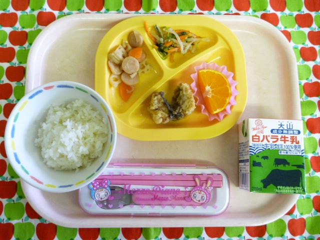 シャキッとれんこん☆よくかんでね☆(2021/11/12) ★ ごはん◆● アジの生姜煮◆● れんこんきんぴら● ごま和え● みかん ※あたたかいご飯はおかわり自由です。※牛乳は年長希望者のみです。★熱や力になるもの ◆血や肉になるもの ●体の調子を整えるもの ツイート