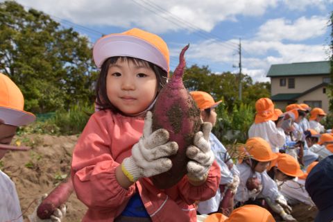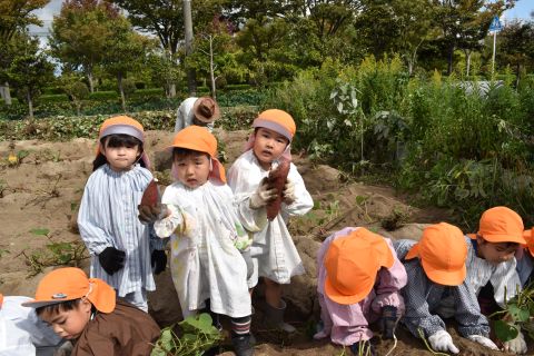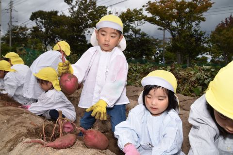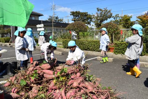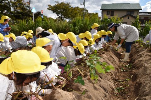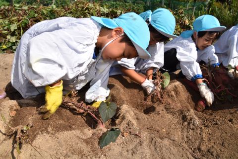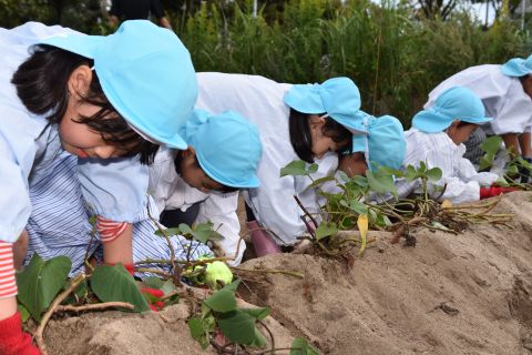 園の菜園で、全園児でクラス毎にサツマイモを収穫しました。