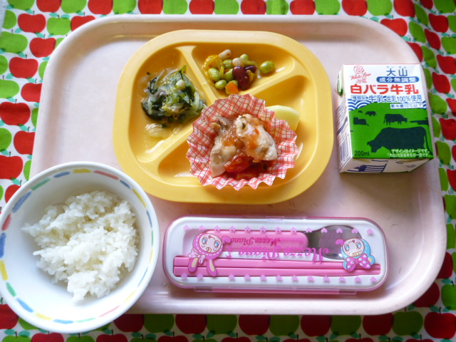 チキンとトマト☆相性バッチリ☆(2021/11/26) ★ ごはん◆● チキントマトソース◆● ほうれん草ソテー● ビーンズサラダ● りんご ※あたたかいご飯はおかわり自由です。※牛乳は年長希望者のみです。★熱や力になるもの ◆血や肉になるもの ●体の調子を整えるもの ツイート