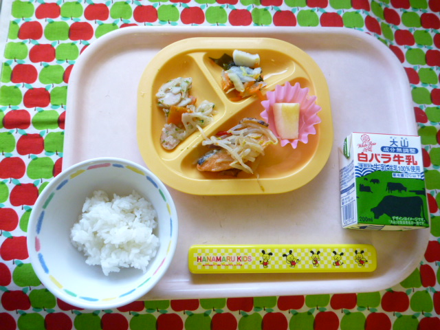 シャキシャキれんこん☆よくかんでね(2021/12/21) ★ ごはん◆● 鮭のちゃんちゃん焼き◆● れんこんのり塩炒め◆● 酢の物● りんご ※あたたかいご飯はおかわり自由です。※牛乳は年長希望者のみです。★熱や力になるもの ◆血や肉になるもの ●体の調子を整えるもの ツイート