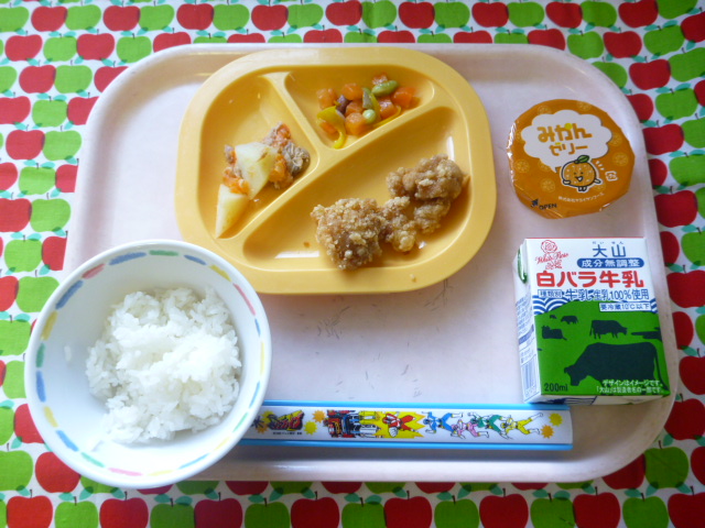 みんな大好き唐揚げだ☆(2022/02/21) ★ ごはん ◆ 鶏の唐揚げ ★◆●ツナじゃが ● ビーンズサラダ ★ みかんゼリー ※あたたかいご飯はおかわり自由です。 ※牛乳は年長希望者のみです。 ★熱や力になるもの ◆血や肉になるもの ●体の調子を整えるもの ツイート