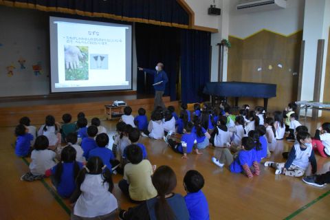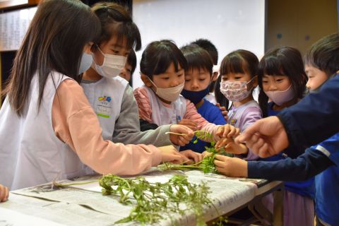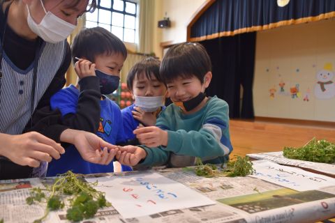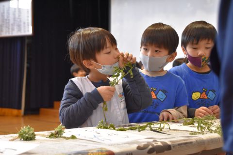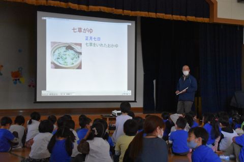 スライドを使って七草粥の由来や、野草についての説明などをみたり、実際に使われている野草をみたりしました。