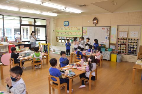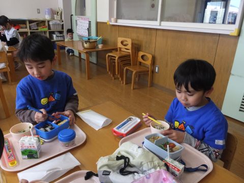 今日は、年長組の子どもたちが七草粥を食べました。