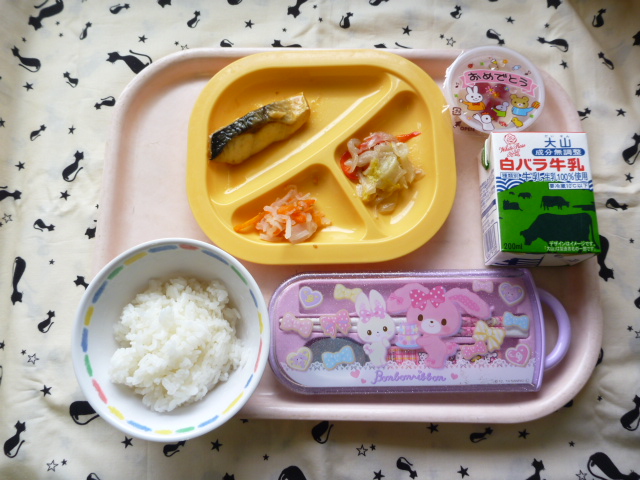 今日はお祝い弁当♪お楽しみに☆(2022/04/18) ★ ごはん ◆ サバの味噌煮 ◆● 肉野菜炒め ● 紅白なます ★ おめでとうゼリー ※あたたかいご飯はおかわり自由です。 ※牛乳は年長希望者のみです。 ★熱や力になるもの ◆血や肉になるもの ●体の調子を整えるもの ツイート