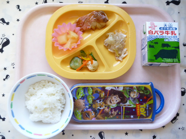 生姜パワーで食欲アップ!(2022/05/24) ★ ごはん ◆ 煮魚 ◆● 豚肉の生姜炒め ● カラフルサラダ ● りんご缶 ※あたたかいご飯はおかわり自由です。 ※牛乳は年長希望者のみです。 ★熱や力になるもの ◆血や肉になるもの ●体の調子を整えるもの ツイート