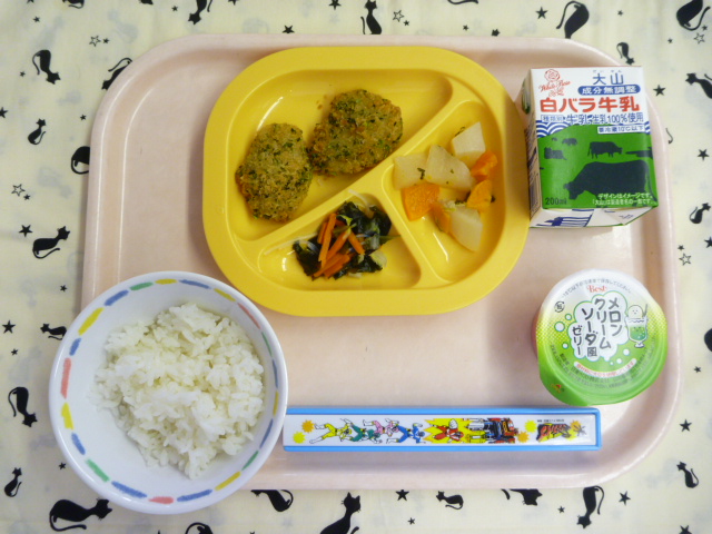 初登場のゼリー☆お楽しみに♪(2022/05/30) ★ ごはん ◆ 白身魚磯辺フライ ◆● 大根旨煮 ★◆●酢の物 ★ メロンクリームソーダ風ゼリー ※あたたかいごはんは、おかわり自由です。 ※牛乳は年長希望者のみです。 ★熱や力になるもの◆血や肉になるもの●体の調子を整えるもの ツイート