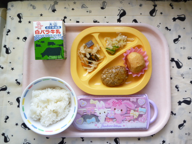 お弁当の定番☆ハンバーグ!(2022/05/31) ★ ごはん ◆ 和風ハンバーグ ◆● 筍の根布煮 ● 梅和え ★ シュークリーム ※あたたかいごはんは、おかわり自由です。 ※牛乳は年長希望者のみです。 ★熱や力になるもの◆血や肉になるもの●体の調子を整えるもの ツイート