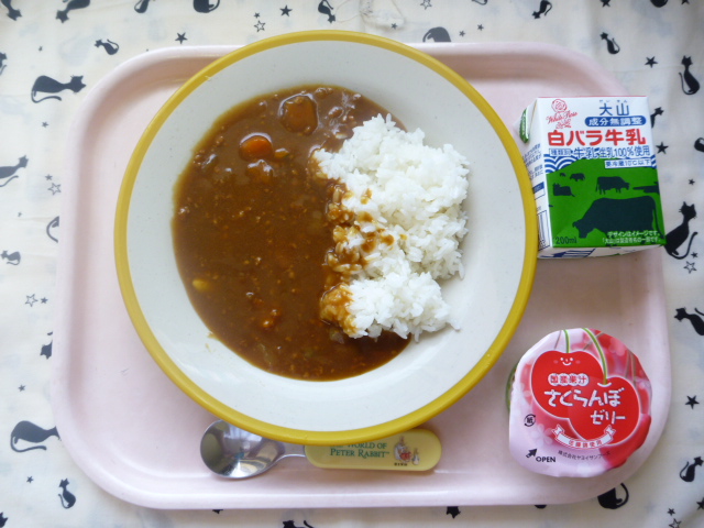 みんなの好きなカレー☆おかわりしてね(2022/06/10) ★ ごはん ◆● 野菜カレー ★ さくらんぼゼリー ※あたたかいご飯・カレーはおかわり自由です。 ※牛乳は年長希望者のみです。 ★熱や力になるもの ◆血や肉になるもの ●体の調子を整えるもの ツイート