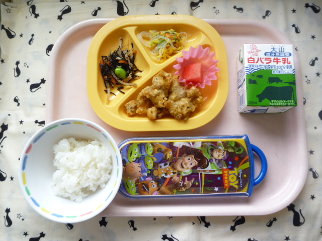 もうすぐ夏だ!スイカを食べよう(2022/06/24) ★ ごはん ◆ 鶏のゆかり天ぷら ◆● 五目ひじき煮 ★◆●千草和え ● スイカ ※あたたかいご飯はおかわり自由です。 ※牛乳は年長希望者のみです。 ★熱や力になるもの ◆血や肉になるもの ●体の調子を整えるもの ツイート