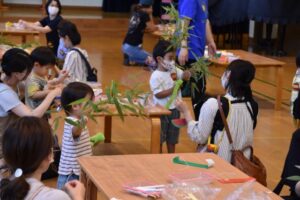 毎年、園庭の裏庭「ふれあいの森」から切ってきた新鮮な笹に飾り付けしています。