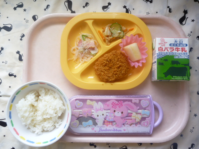 ツルツル食べれる♪春雨ソテー☆(2022/09/26) ★ ごはん ● かぼちゃコロッケ ★◆●春雨ソテー ◆● ツナサラダ ● りんご ※あたたかいご飯はおかわり自由です。 ※牛乳は年長希望者のみです。 ★熱や力になるもの ◆血や肉になるもの ●体の調子を整えるもの ツイート