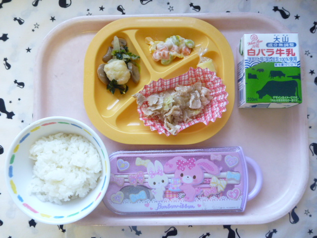 生姜のパワーで食欲アップ(2022/09/30) ★ ごはん ◆● 豚肉の生姜炒め ◆● エビ団子の中華風 ● ビーンズサラダ ◆ チーズ ※あたたかいご飯はおかわり自由です。 ※牛乳は年長希望者のみです。 ★熱や力になるもの ◆血や肉になるもの ●体の調子を整えるもの ツイート