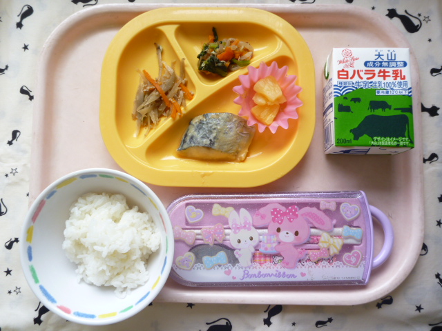 サゴシは青魚の仲間です!(2022/10/05) ★ ごはん ◆ サゴシの西京焼き ◆● きんぴらごぼう ◆● おかか和え ● パイン缶 ※あたたかいご飯はおかわり自由です。 ※牛乳は年長希望者のみです。 ★熱や力になるもの ◆血や肉になるもの ●体の調子を整えるもの ツイート