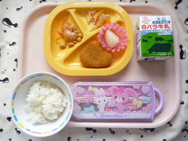 栗の形をしたかわいいコロッケ♪(2022/10/07) ★ ごはん ★ 栗コロッケ ◆● ポークビーンズ ◆● ツナサラダ ● 梨 ※あたたかいご飯はおかわり自由です。 ※牛乳は年長希望者のみです。 ★熱や力になるもの ◆血や肉になるもの ●体の調子を整えるもの ツイート