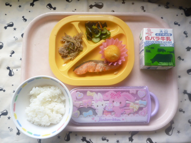 海藻でミネラルをとろう!(2022/10/25) ★ ごはん ◆ 鮭の蒲焼き風 ◆● 牛しぐれ煮 ◆● 海藻サラダ ◆ チーズフライ ※あたたかいご飯はおかわり自由です。 ※牛乳は年長希望者のみです。 ★熱や力になるもの ◆血や肉になるもの ●体の調子を整えるもの ツイート