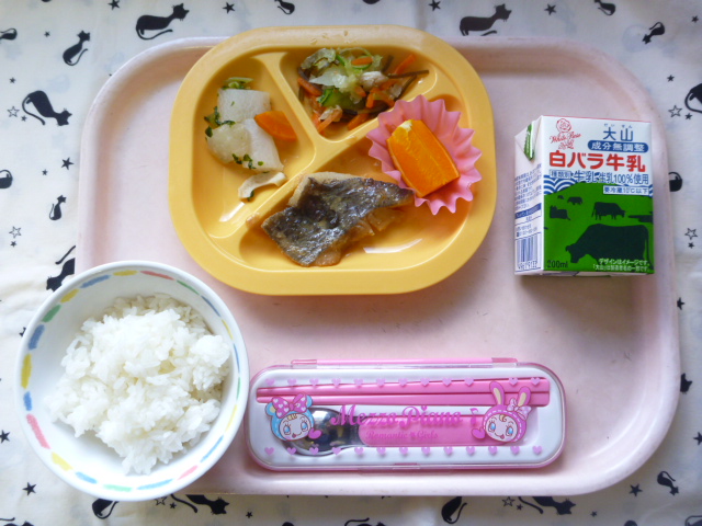 今日の魚はゴマ香る味噌煮だよ☆(2022/11/04) ★ ごはん ◆ 白身魚のゴマ味噌煮 ◆● 大根旨煮 ◆● キャベツの塩昆布和え ● オレンジ ※あたたかいご飯はおかわり自由です。 ※牛乳は年長希望者のみです。 ★熱や力になるもの ◆血や肉になるもの ●体の調子を整えるもの ツイート