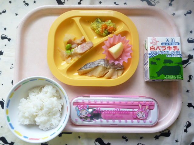 ミモザの花のようなサラダです♪(2022/12/02) ★ ごはん ◆ 白身魚のコンソメ煮 ★◆●ジャーマンポテト ◆● ミモザサラダ ● りんご ※あたたかいご飯はおかわり自由です。 ※牛乳は年長希望者のみです。 ★熱や力になるもの ◆血や肉になるもの ●体の調子を整えるもの ツイート