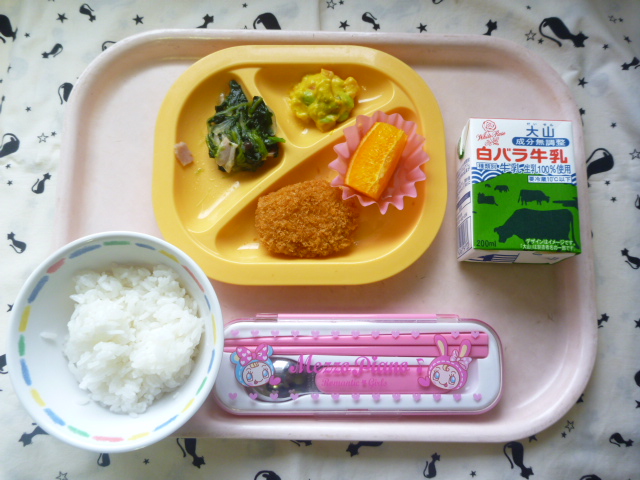 カロテン豊富なかぼちゃサラダ(2022/12/07) ★ ごはん ★ カレーコロッケ ◆● ほうれん草ソテー ● かぼちゃサラダ ● オレンジ ※あたたかいご飯はおかわり自由です。 ※牛乳は年長希望者のみです。 ★熱や力になるもの ◆血や肉になるもの ●体の調子を整えるもの ツイート