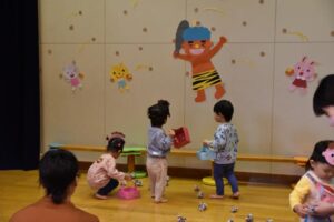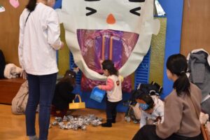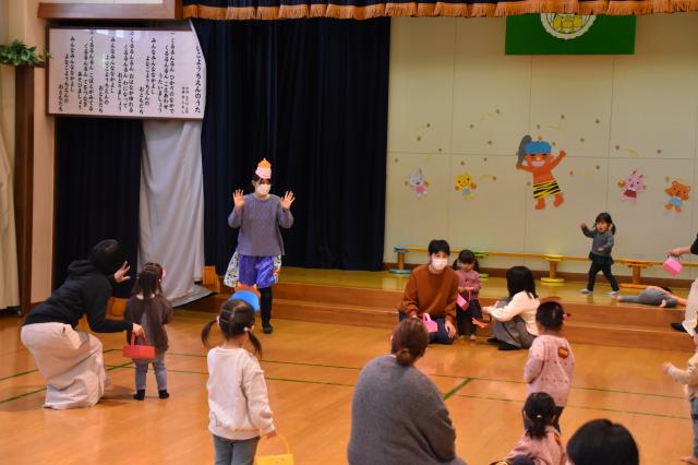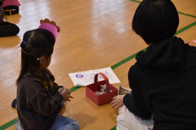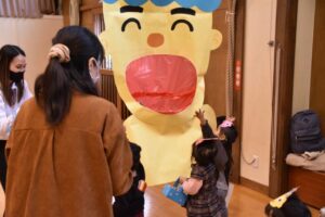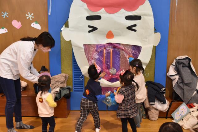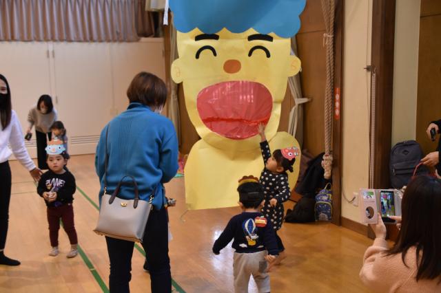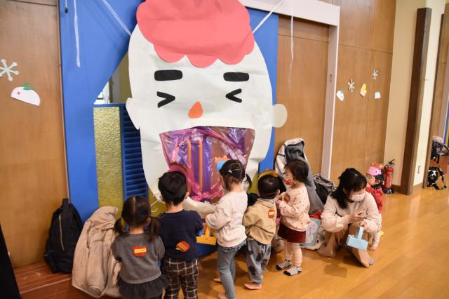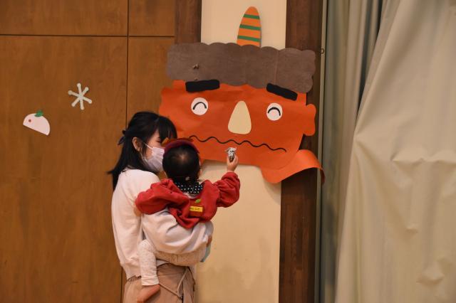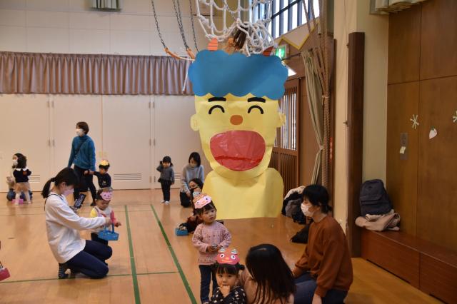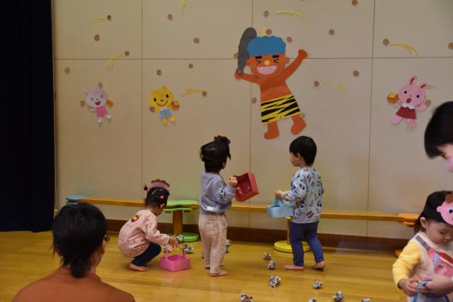 遊戯室に登場した鬼さんに新聞紙の豆を投げたり、優しく食べさせてあげたり、豆箱にひたすら豆を集めたり…一人ひとりの楽しみ方でじっくりと楽しんでいる姿が見られました。みんなよく頑張りました(*^^*)