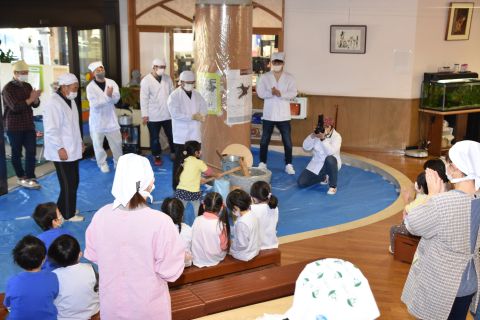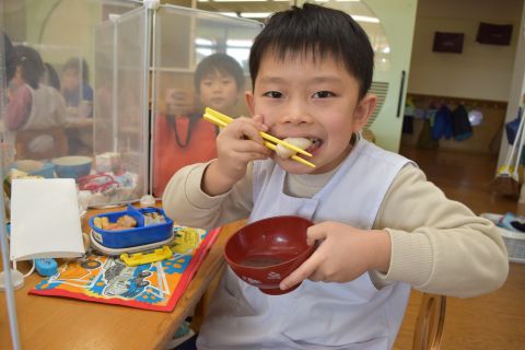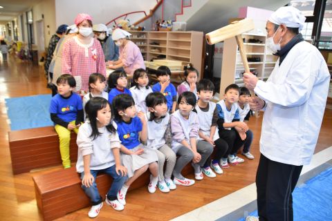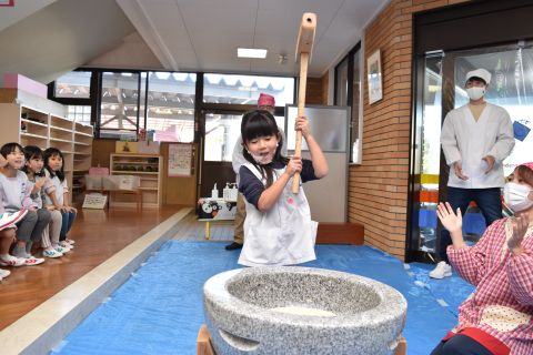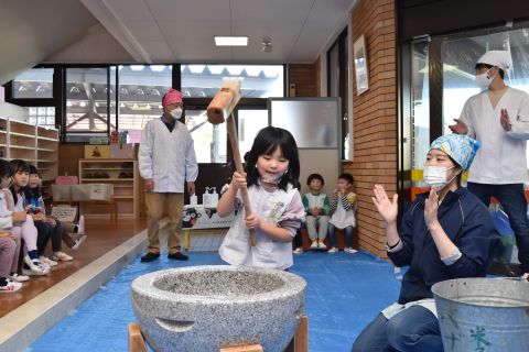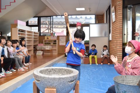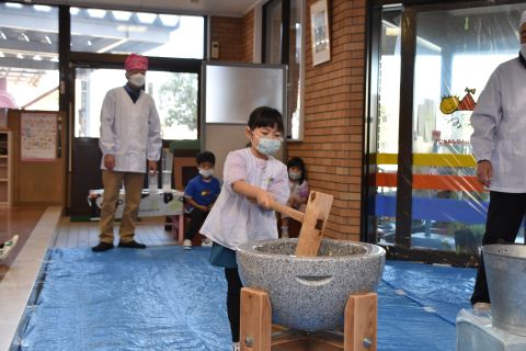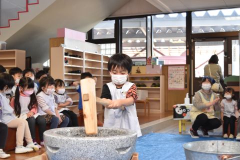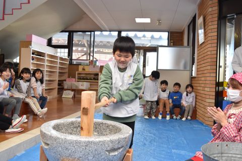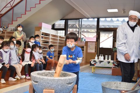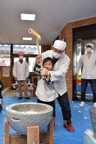 もちつき(2023/01/12) もち米を蒸す様子や、おもちになっていく過程を見たり、また交替でおもちをついたり、丸めたりしてみんなで楽しみました。 つきたてのお餅で作ってもらった“ぜんざい”はとてもおいしかったです。 お父さん、お母さん、おじいちゃん、おばあちゃんたくさんの方に手伝っていただき、とっても楽しい餅つきができました。 お手伝いいただきありがとうございました。 ツイート