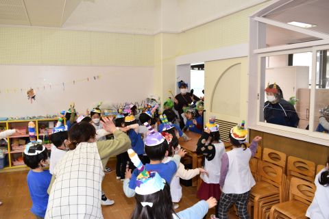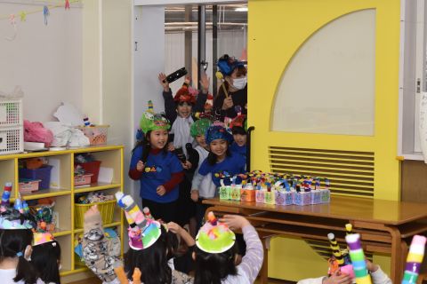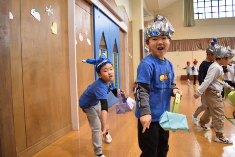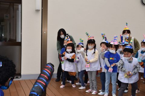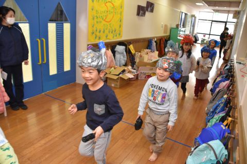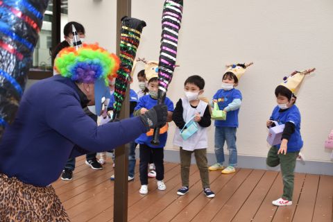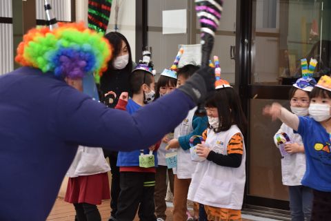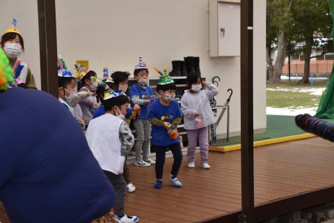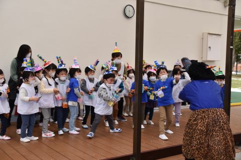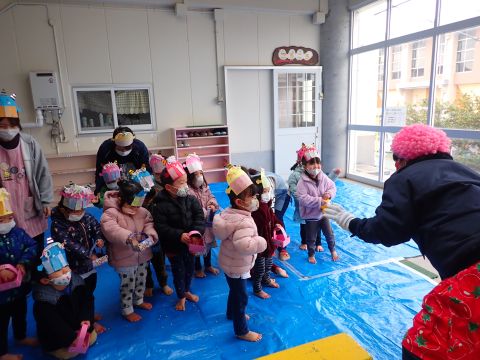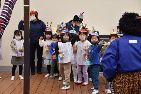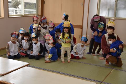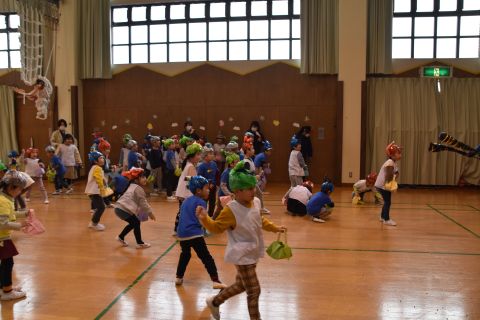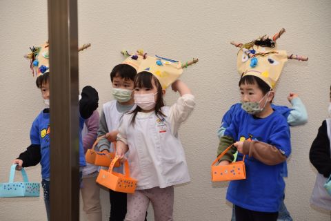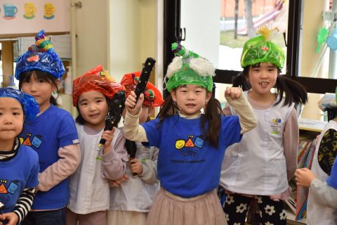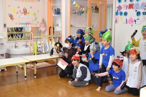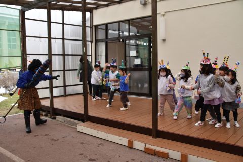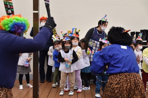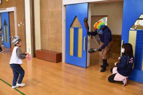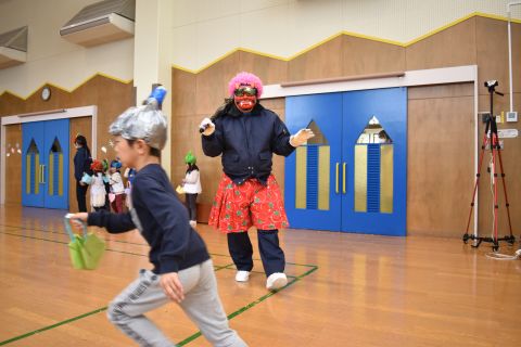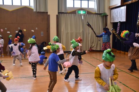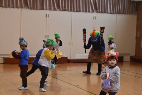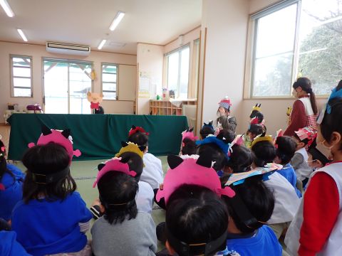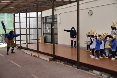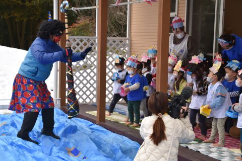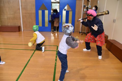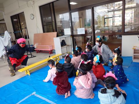 その後、園長先生から豆まきの由来の話を聞いたり、寸劇を観て楽しみました。