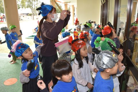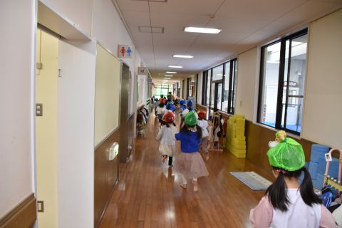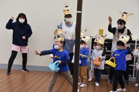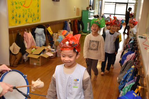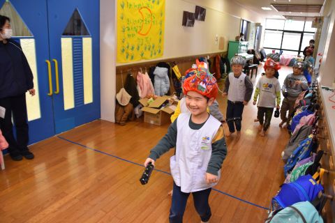 最初に年長組の子どもたち扮する鬼が、ちいさい組の子どもたちの教室を回りました。