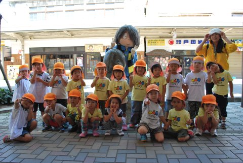 年少組遠足(2013/09/19) 年少組の子どもたちが、境港水木ロードと竜が山公園に遠足に行きました。 水木ロードでは鬼太郎やねずみ男が出迎えてくれました。 妖怪たちの出迎えにみんな大騒ぎでした。 竜が山公園では、お弁当を食べた後、いろいろな木のみを見つけたり、葉っぱで遊んだり、自然に触れて遊びました。 ツイート