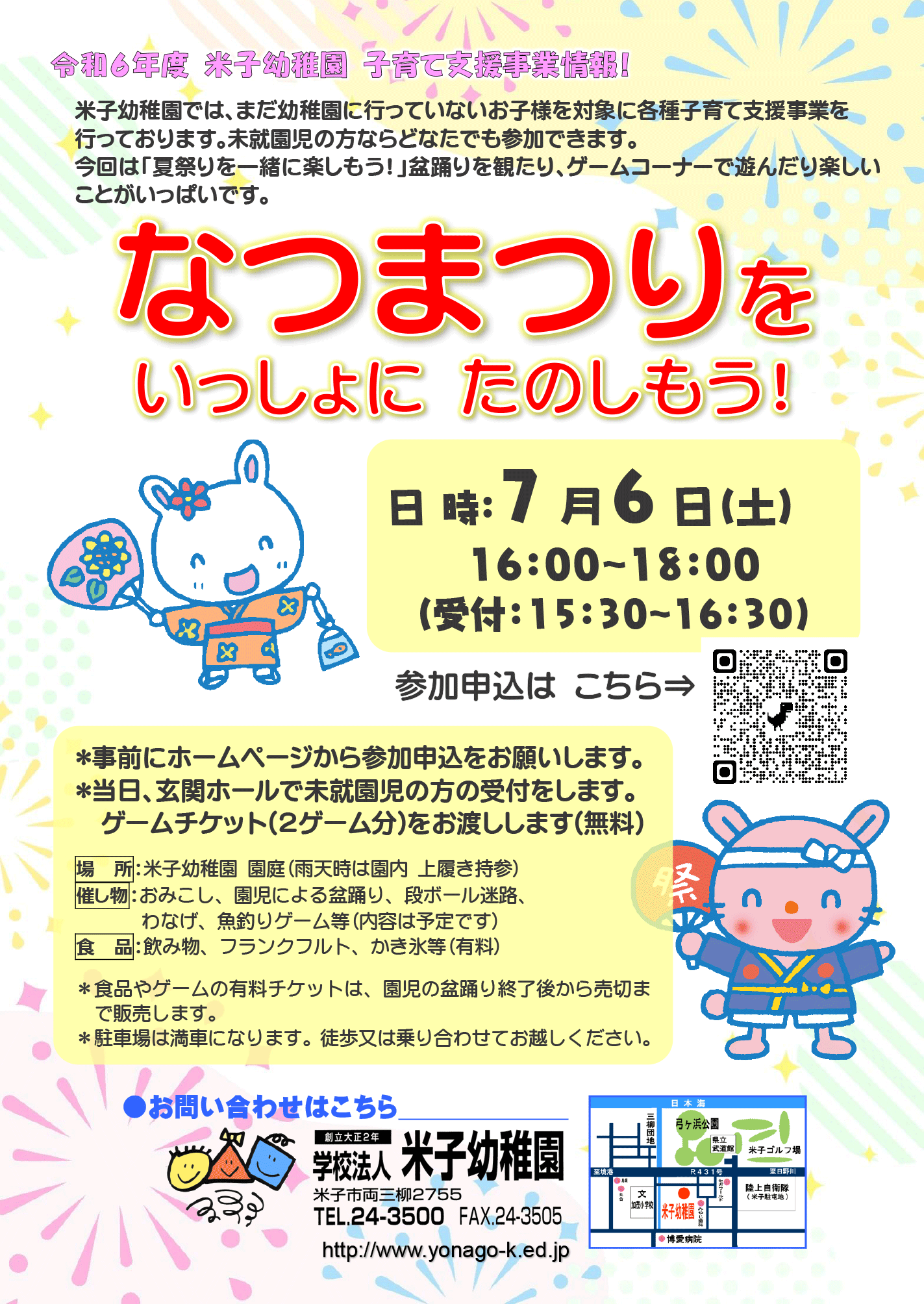 催し物:おみこし、園児による盆踊り、段ボール迷路、ボーリングゲーム、お菓子釣り等