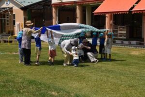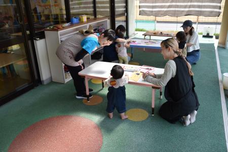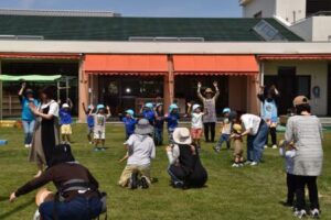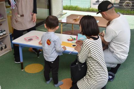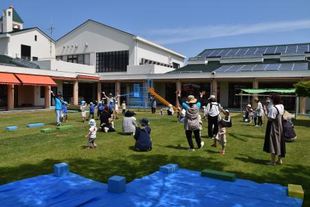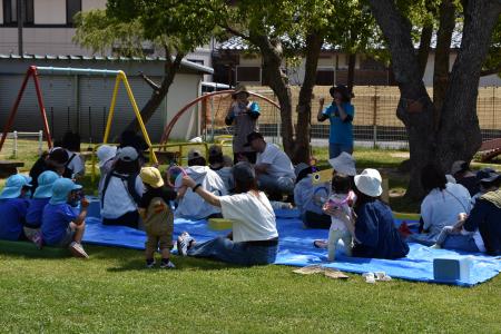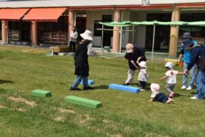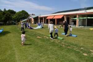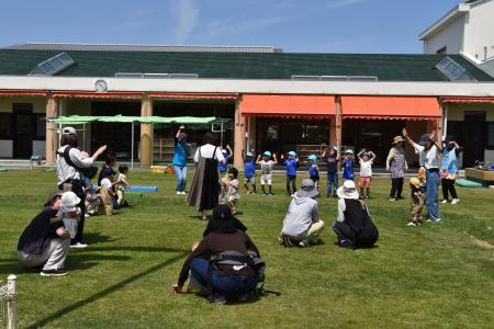 それから、芝生の園庭に場所を変えて、青空の下で「どうぶつ体操」をしたり、「よ~いドン!」をしたり、親子で体を動かして遊びました!