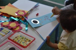 はじめに、シールやペンを使って、こいのぼりを作りました!